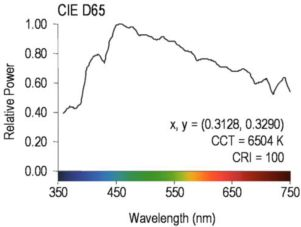 看下圖,雖然都是D65的光源,色溫時(shí)6500.但是光譜形狀不同。一個(gè)適合標(biāo)準(zhǔn)光源的光譜,一個(gè)是熒光燈管的光譜,另外一個(gè)是采用IQ-LED技術(shù)模擬的光譜。從圖中可以看出,標(biāo)準(zhǔn)光譜和模擬光譜很相似,基本相同,但是熒光燈管的光譜卻和其有很大的差異。所以這個(gè)時(shí)候就不能單純的簡(jiǎn)單的只看色溫。